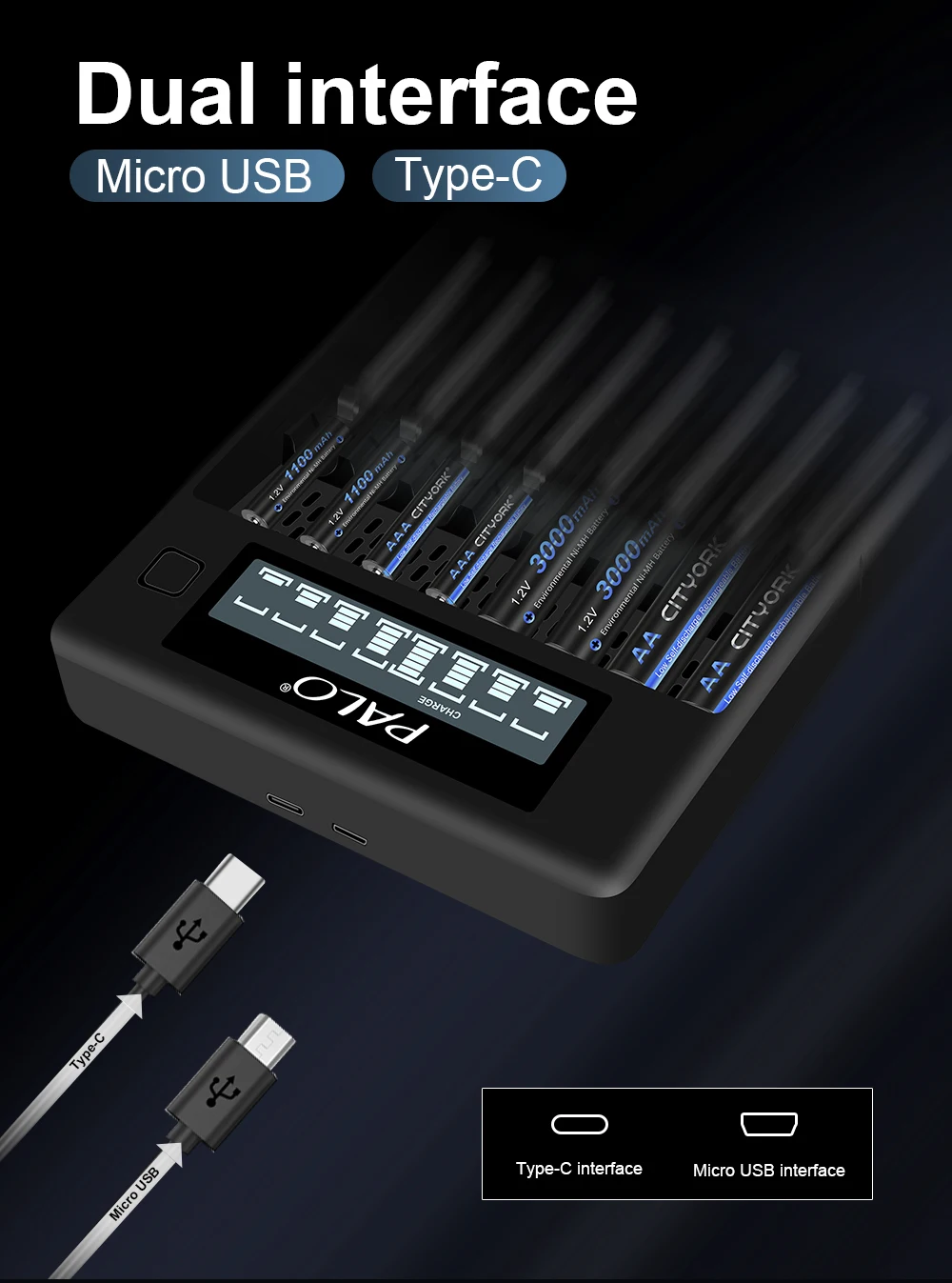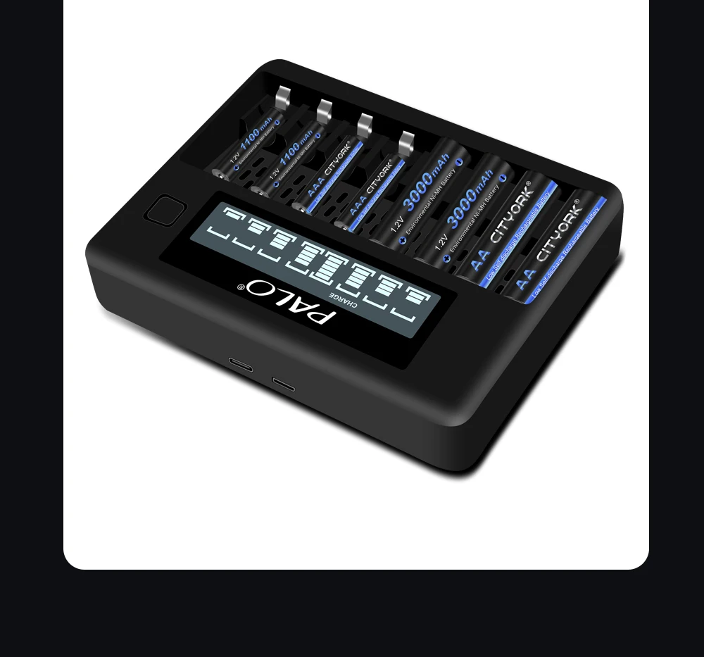 1. este carregador pode carregar 1-8pcs 1.2v aa/aaa ni-mh/ni-cd baterias recarregáveis, com displays lcd para exibir a porcentagem de carregamento.